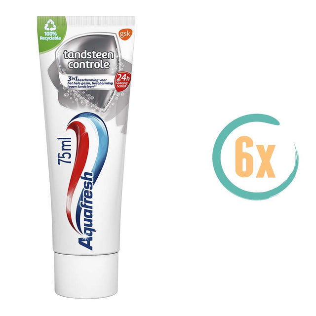 Bij bestelling ontvangt u 6 tubes Aquafresh Tandsteen Controle Tandpasta van 75ml. (producent GSK)